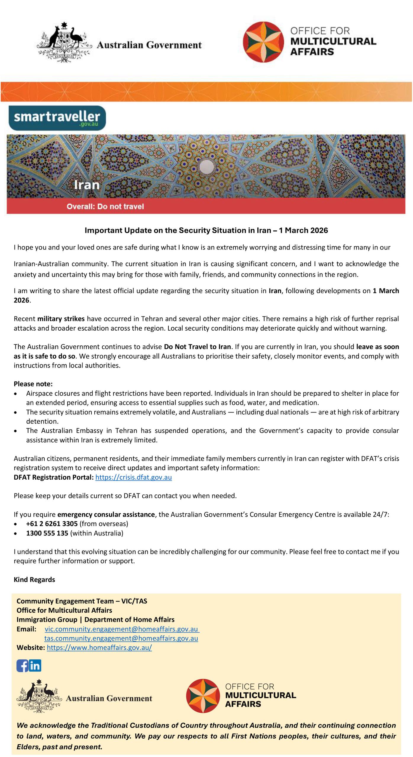 02/03/202602/03/2026 Website Manager Important Update on the Security Situation in Iran Smart Traveller – 1 March 2026